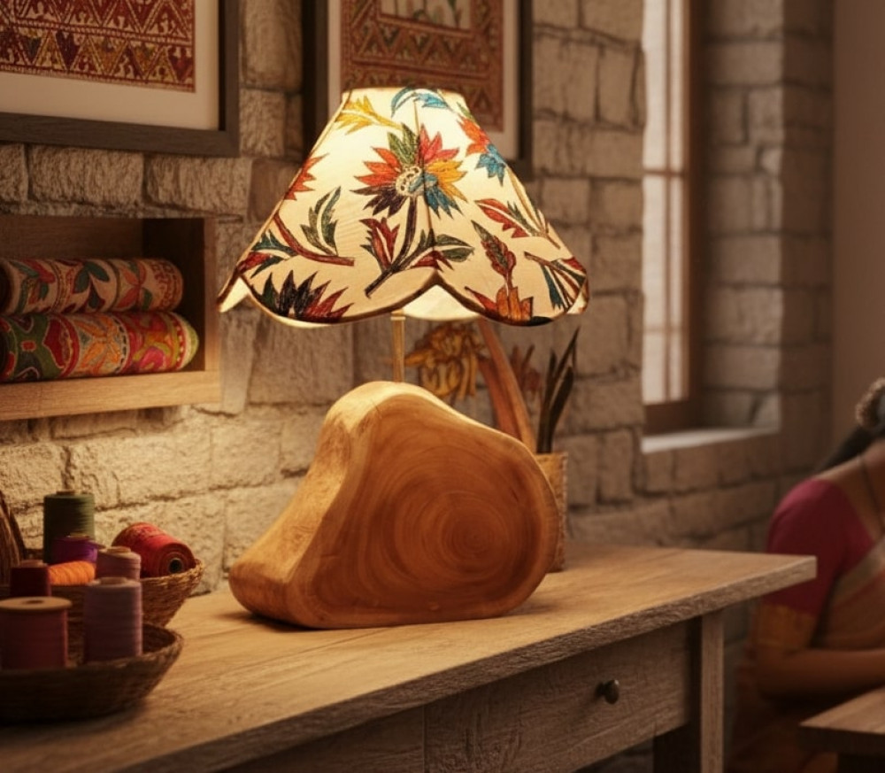 This handcrafted lamp pairs the organic grace of solid hardwood with the delicate artistry of Kantha embroidery, an age-old stitch passed down through generations of skilled women artisans in India.